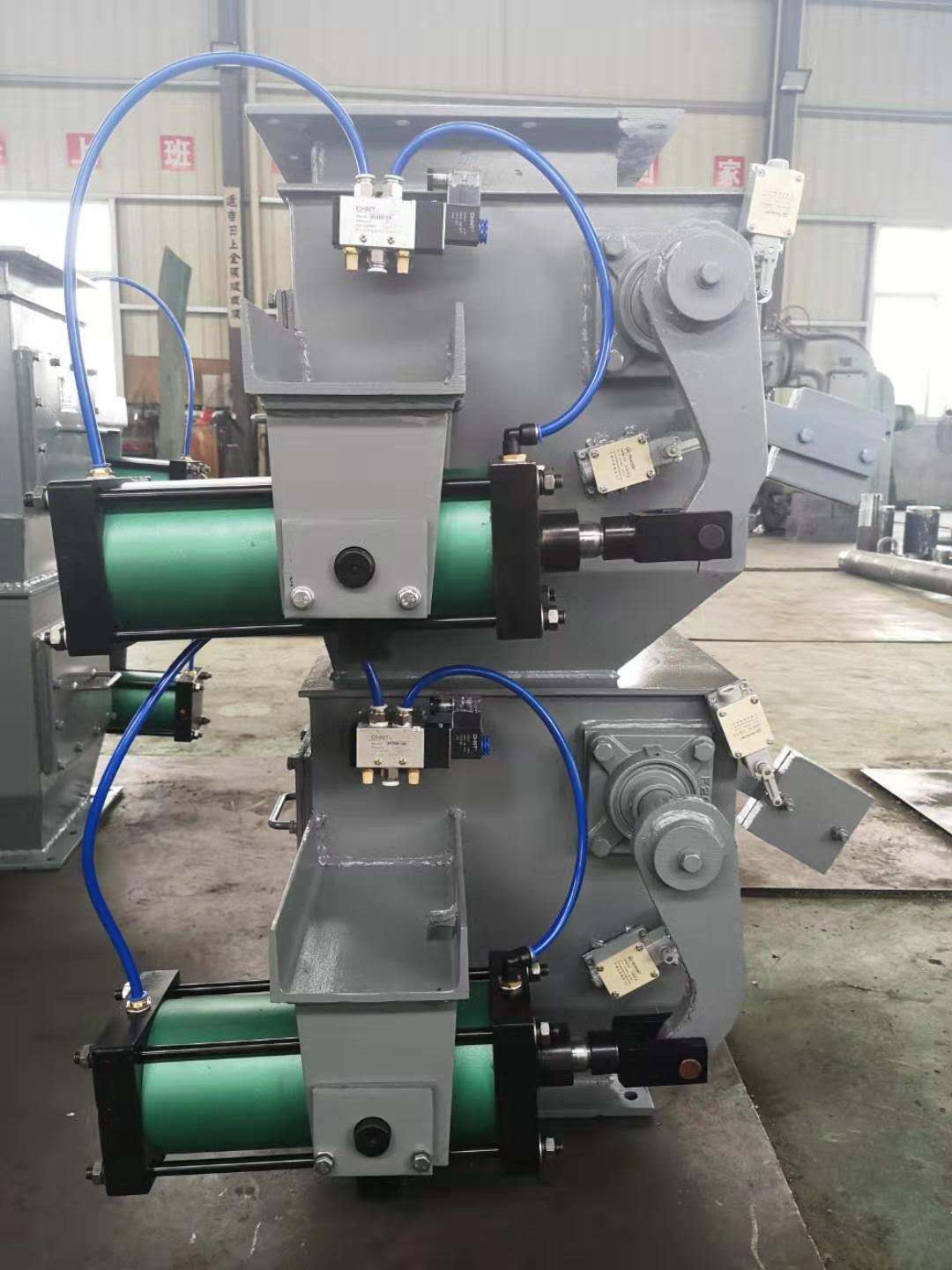 新型復(fù)式智能電動雙層卸灰閥上、下閥采用獨立驅(qū)動裝置,分別控制上、下卸灰閥打開或關(guān)閉。密封部位采用軟性密封件,且密封件通徑大于卸灰閥閥口通徑,卸料過程對密封件無沖刷,保證了密封件使用壽命。本卸灰閥工作時,系統(tǒng)程序與皮帶聯(lián)動,初始狀態(tài)為上閥常開,下閥關(guān)閉,將大煙道中的物料通過料倉儲存在卸灰閥中部儲料倉中。按PLC程序依次定時、定量排料,關(guān)閉上卸灰閥后打開下卸灰閥,將中部儲料倉的物料卸出,卸料完成關(guān)閉下閥后再打開上閥,進(jìn)入下個循環(huán)程序。如遇大量落料,物料在卸灰閥中部儲料倉堆積高度到達(dá)阻旋料位計時,PLC接收到信號后將進(jìn)入排料程序,排料后系統(tǒng)自動恢復(fù)至定時排料程序。由于在此過程中,始終有一個閥處于關(guān)閉狀態(tài),因此保證了系統(tǒng)的氣密性,負(fù)壓波動小,生產(chǎn)穩(wěn)定,煙道下料倉只是落料通道物料落入卸灰閥中部料倉內(nèi),卸灰閥完成排料工作,徹底解決了堵倉現(xiàn)象。從而保證了卸灰系統(tǒng)在不漏風(fēng)的狀態(tài)下正常運(yùn)行。